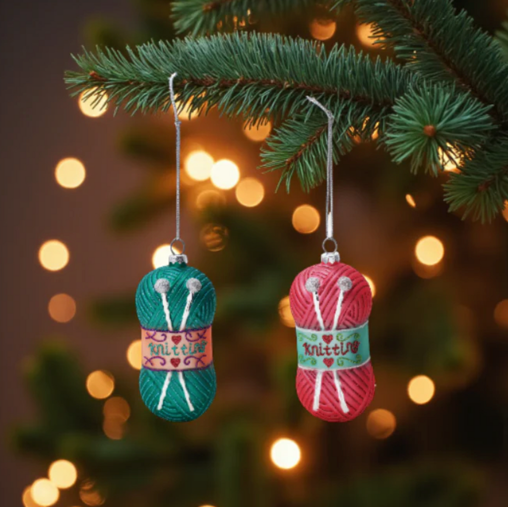 CREATIVE - Glass Yarn & Needles Ornament with Glitter, 4-3/4"H