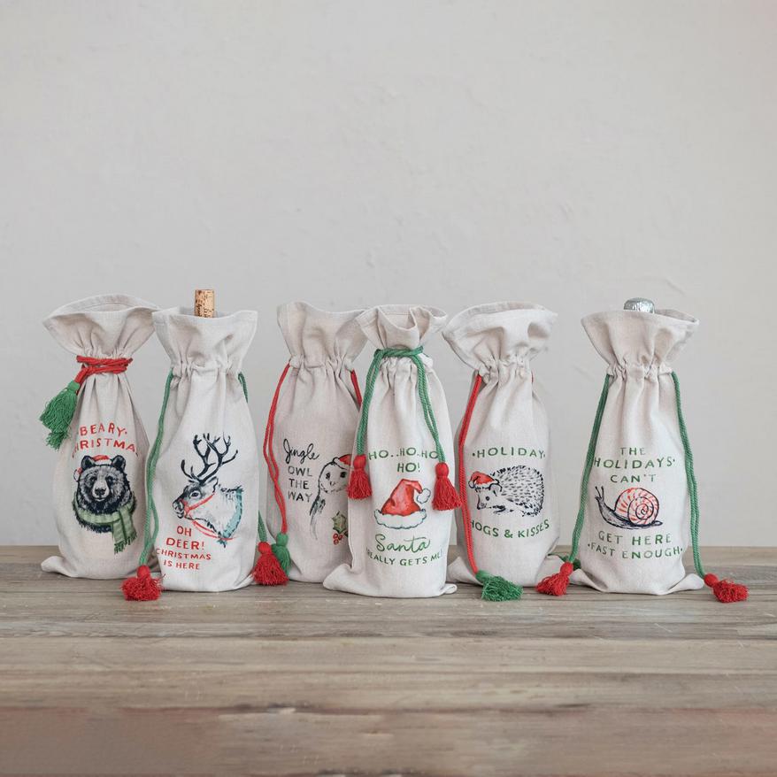 CREATIVE - Cotton Chambray Printed Drawstring Wine Bag w/ Tassels ©