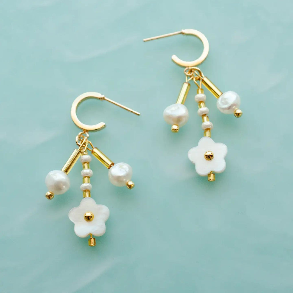 Earrings are made with an assortment of freshwater pearls. Hoops are 14mm gold-plated over stainless steel.