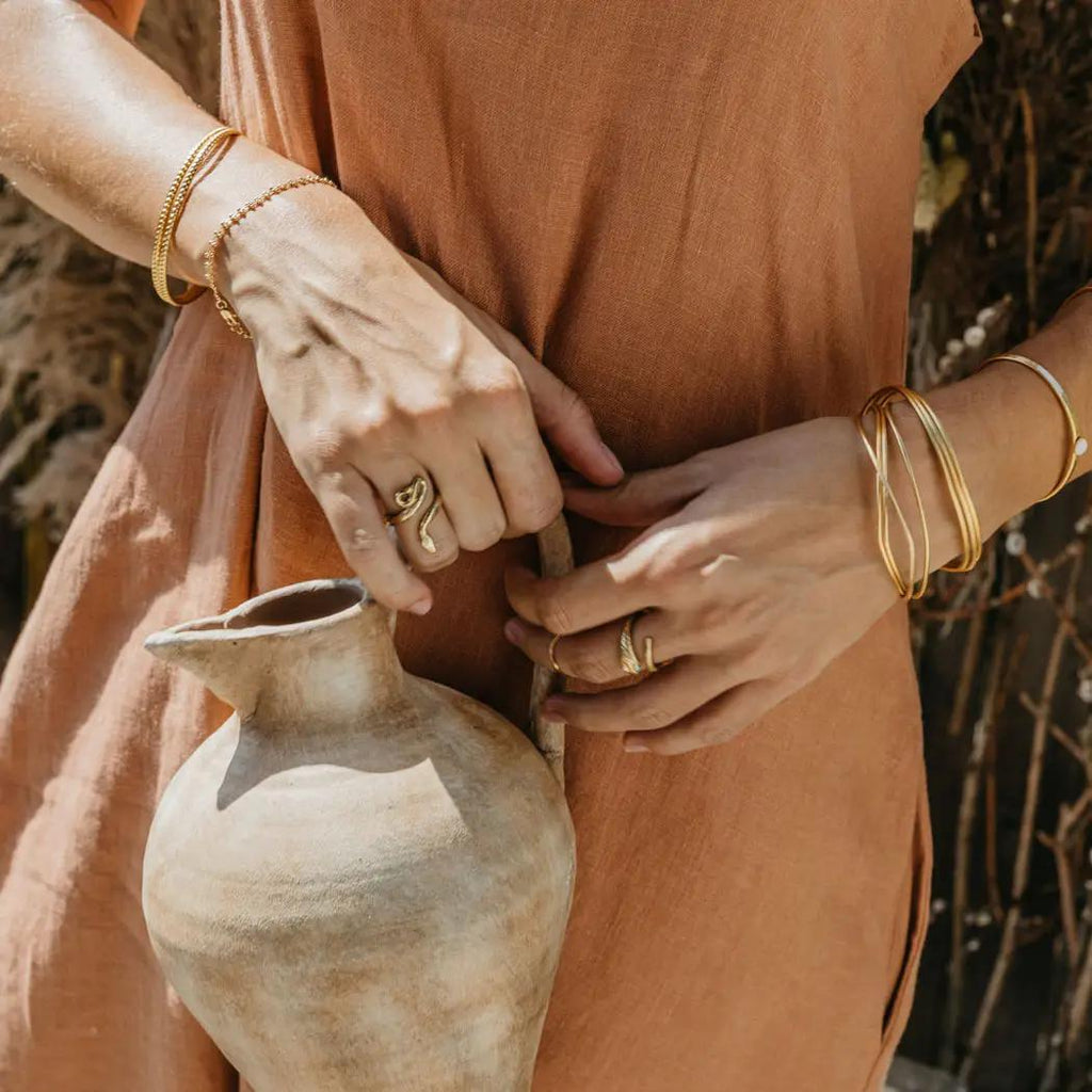 Even Cleopatra of Egypt wore snake jewelry, and in the ancient world, snakes were associated with goddesses. Cast in a warm, earthy jeweler’s brass in a size 7. It adjusts up and down about one size. Brass will oxidize over time but can be polished up with a jeweler's cloth or brass cleaner.