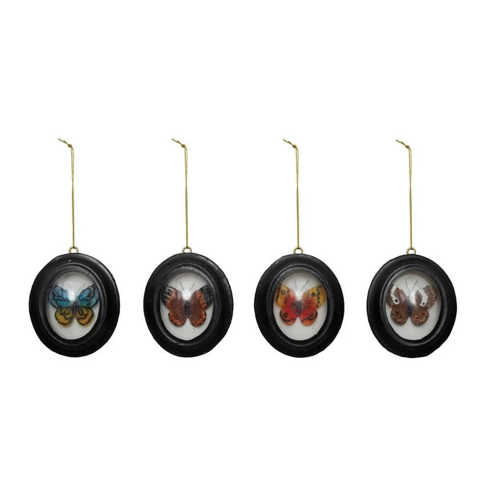 Made of cast resin and plastic, butterflies are house in a little convex frame. Ready to hang from an attached cord. Hang them on your tree, accent a holiday wreath or use them as a package accent. A hint of glitter adds sparkle and shine.