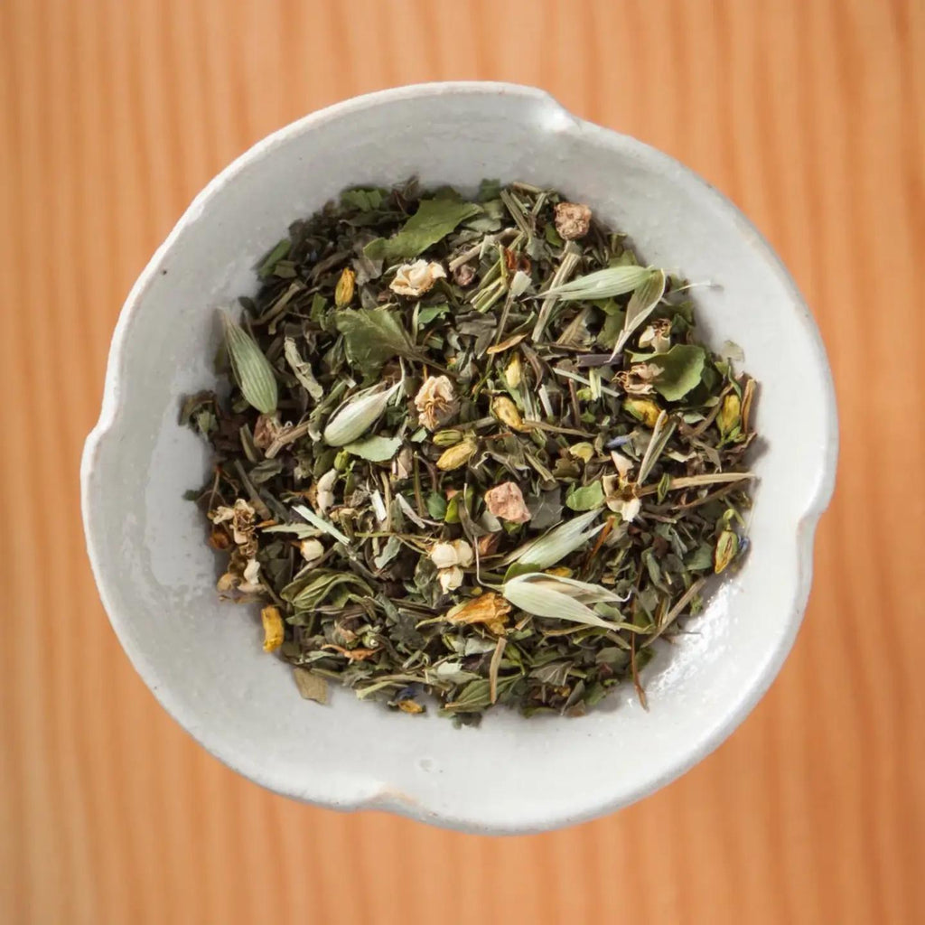 INGREDIENTS | Organic Lemon Balm*, Organic Oat Straw*, Organic Spearmint*, Wild Hypericum Flowers*, Organic Gotu Kola, Wild Hawthorn Flowers*, Organic Skullcap*, Organic Rhodiola Root, Organic Rosemary *USA Grown Herbs