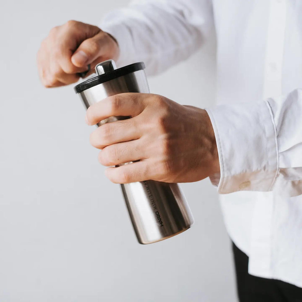 Crafted from stainless steel, this grinder combines a luxurious, robust feel with lightweight portability, perfect for both home and travel. Its stepped grind adjustment mechanism allows easy setting changes, ensuring precise results for any brew. Its enhanced ceramic grind shaft provides stable grinding, while the handle attaches and detaches effortlessly. The grounds bottle connects to the hopper via a bayonet mount, making it simple to remove and pour your coffee. Elevate your coffee experience with this elegantly designed, user-friendly grinder.