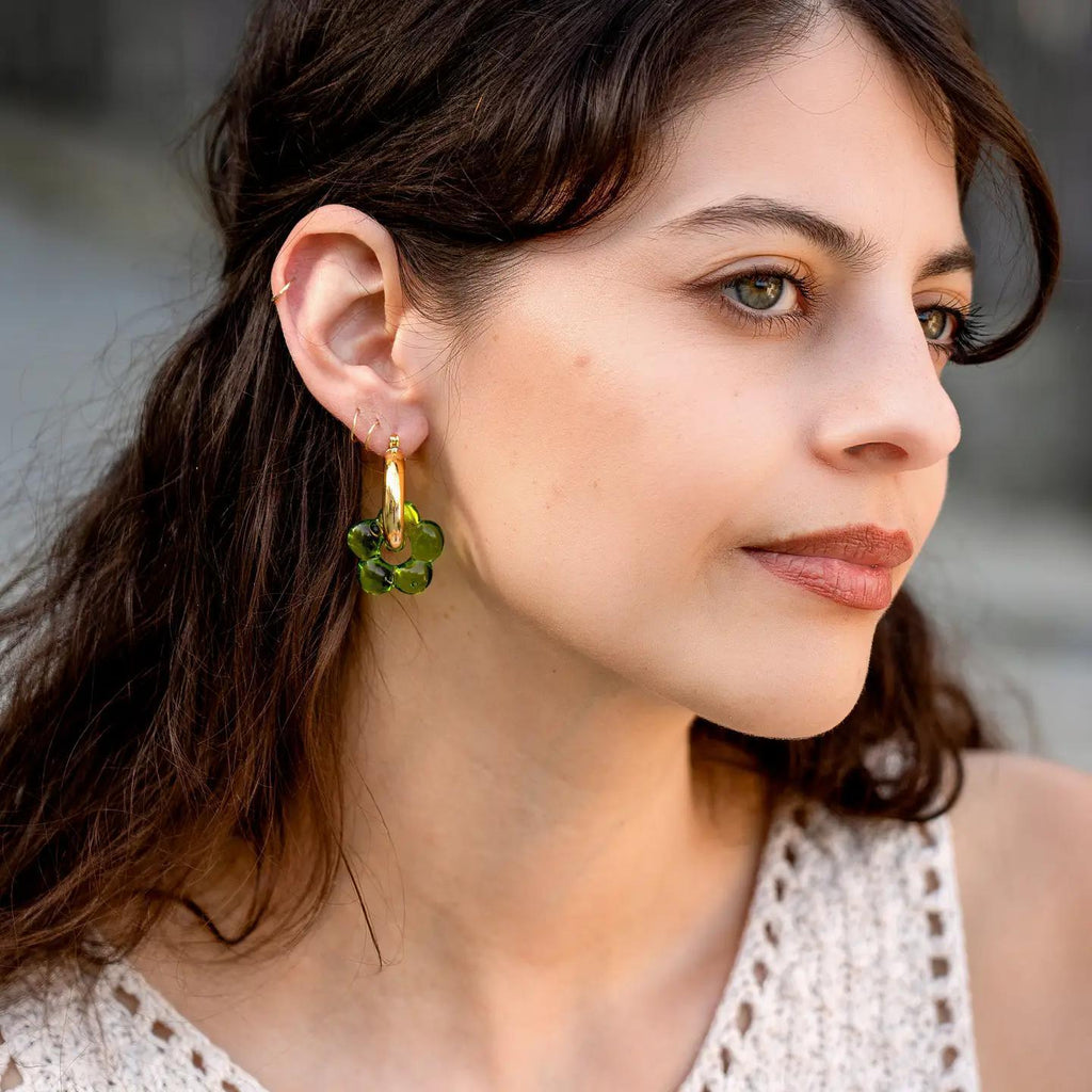 Introducing the Dazy Glaze in green grass earrings. Featuring a lamp work glass flower centerpiece set on a 18k gold-plated hoop, these earrings will add a hint of cute and romantic vibes to whatever you decide to pair up.
