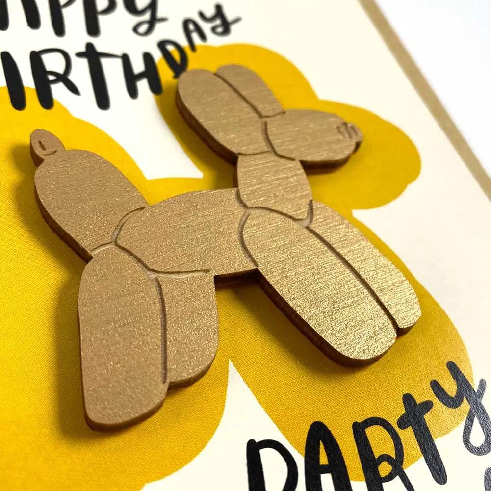 A shiny balloon animal dog magnet for all those party animals (or jeff koons fans) in your life. Removable laser-engraved magnet attached to the front of an A2 greeting card on cream stock.