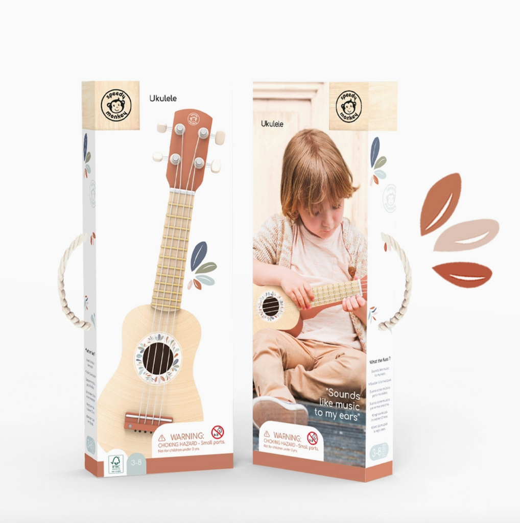 Because music ignites all areas of child development, this soft nylon four string toy ukelele is a must have for your little one! A nice terracotta and wooden color with surface coating designed to prevent finger injuries. Easy to carry around, your child will enjoy the sound and actively stimulate his apprenticeship. This wooden toy ukelele will encourage the development of their musical aptitude. This toy is crafted from sustainably sourced wood from FSC® certified forests. Presented in a beautiful gift box.