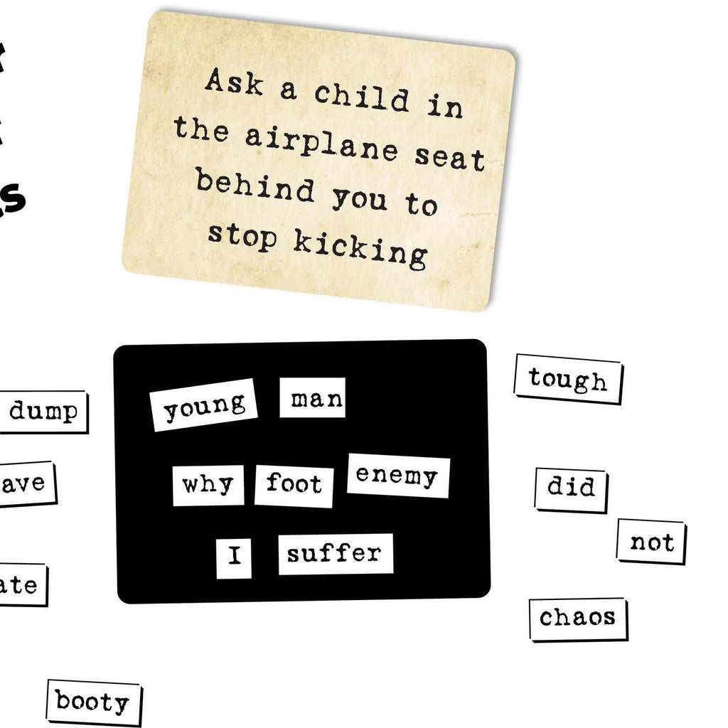 The game of hilariously terrible sentences! Compete against your friends to answer outlandish prompts with only your limited pool of word magnets, forcing all to create laugh-out-loud awful sentences every found. Endlessly replayable, and a hilarious fit for adult game nights and adult family game nights.